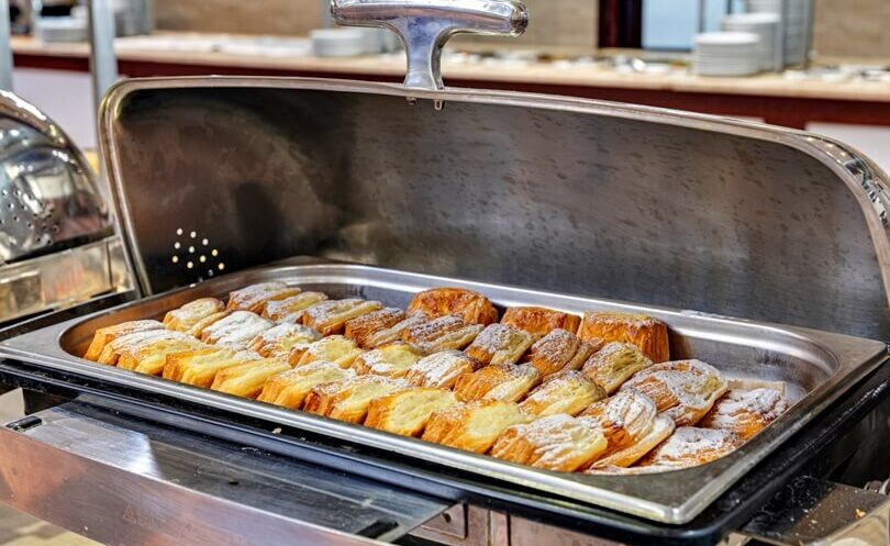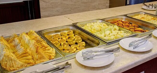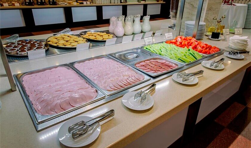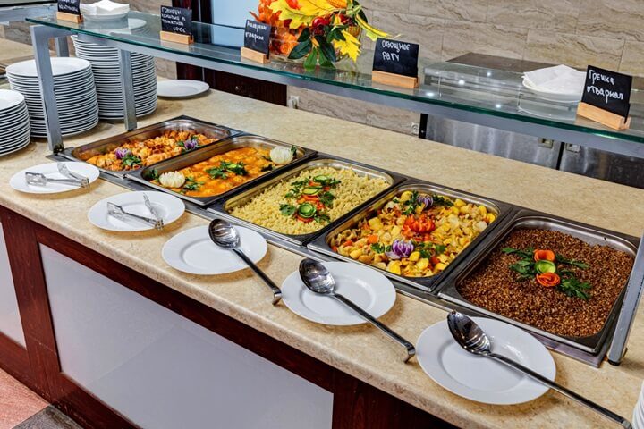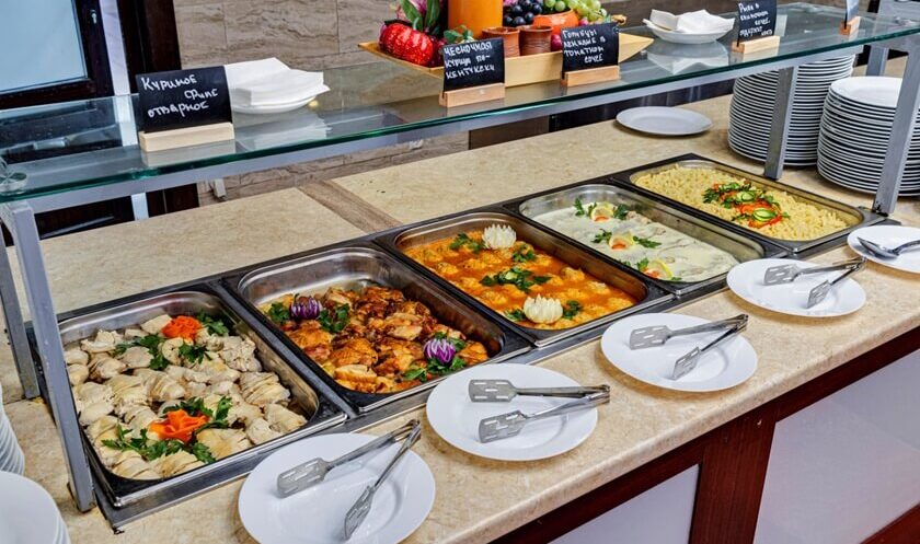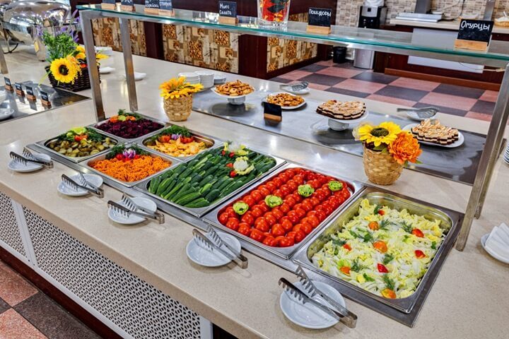 В меню шведского стола представлены блюда русской и европейской кухни.
